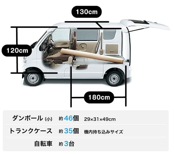 軽貨物の荷台サイズ(180cm×130cm×120cm)に積載出来る荷量でしたら配送可能です。ただし、⻑物などで210cmまでの⻑さのものでしたら、助⼿席を倒す形で積載が可能です。1台に積載出来ない個数の場合は複数台発注もしていただけます。